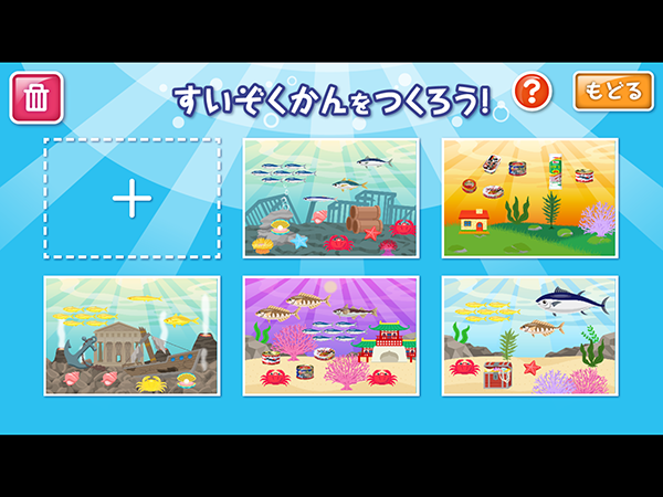 「ウミオスのすいぞくかんをつくろう!」では、魚や缶詰、かざりのパーツを組み合わせて自分だけのすいぞくかんをつくることができます。